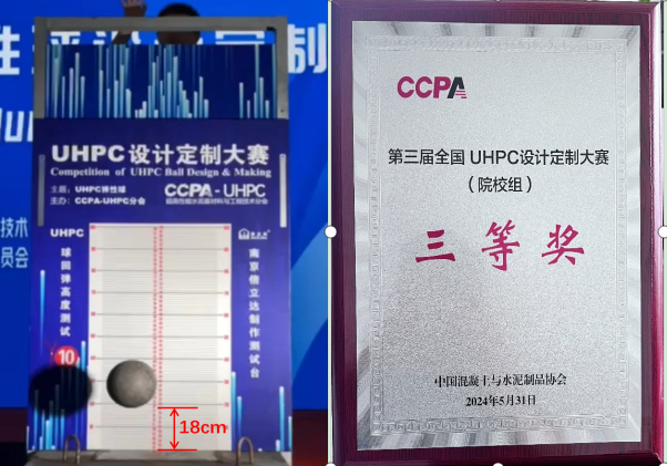本届大赛以“UHPC弹性球设计定制”为主题,要求参赛队伍严格按照规定的尺寸与重量标准,设计并制作出具有卓越“弹性”与“轻质高强”特性的UHPC弹性球,并在现场接受严格的性能测试。在我校蔺鹏臻教授的悉心指导下,研究生颜维毅、张德培、王志远和张智策组成的兰州交通大学代表队凭借自主研发的UHPC作品脱颖而出,以18cm的回弹高度,荣获大赛三等奖,充分展现了我校在UHPC材料研发与应用领域的创新实力与卓越成果。
