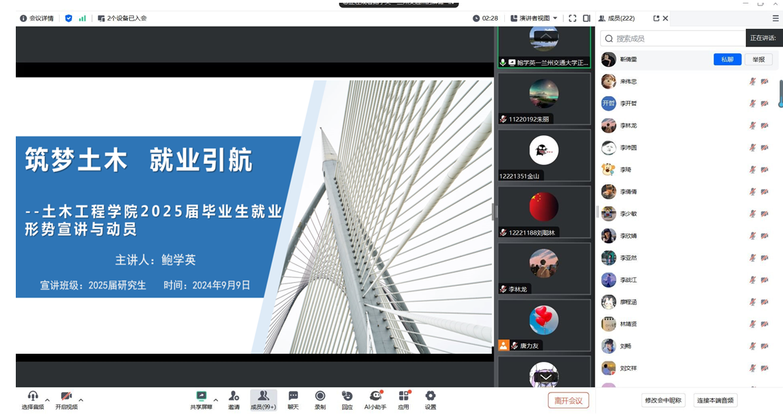 为主动积极帮助2025届研究生深入理解国家的战略部署与政策方针,规划好未来职业方向,切实增强就业竞争力,9月9日,土木工程学院召开了2025届毕业生就业形势宣讲与动员会,会议以线上的形式召开。2025届研究生共计200余名同学积极参与,会议由土木工程学院主管研究生副院长鲍学英主持。