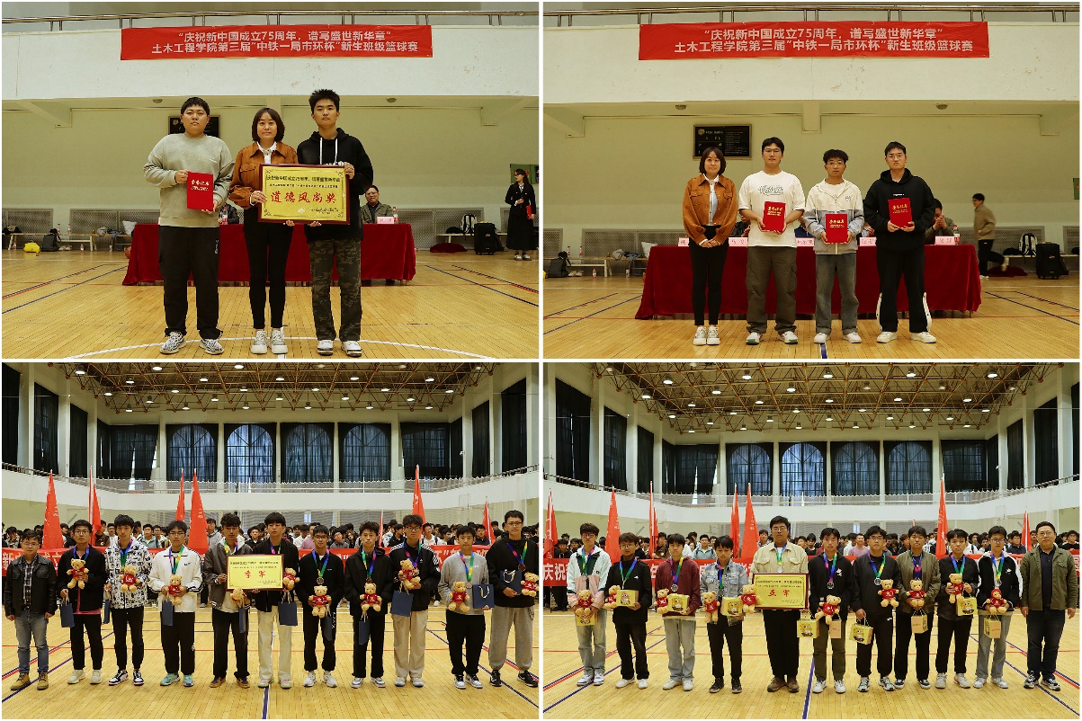 在充满激情与活力的比赛中,不仅展现了各班队员们卓越球技和团队协作能力,也为同学们带来一场场精彩的篮球赛事。篮球赛场上的每一分汗水和努力,都是对篮球精神的最好诠释。经过四天四轮激烈角逐,铁道2406班获得班级新生篮球赛冠军;铁道2401班获得亚军;土木2405班获得季军;土木2404班和工管2401班获得道德风尚奖;道桥2401班,道桥2402班,水利2402班获得优秀组织奖。