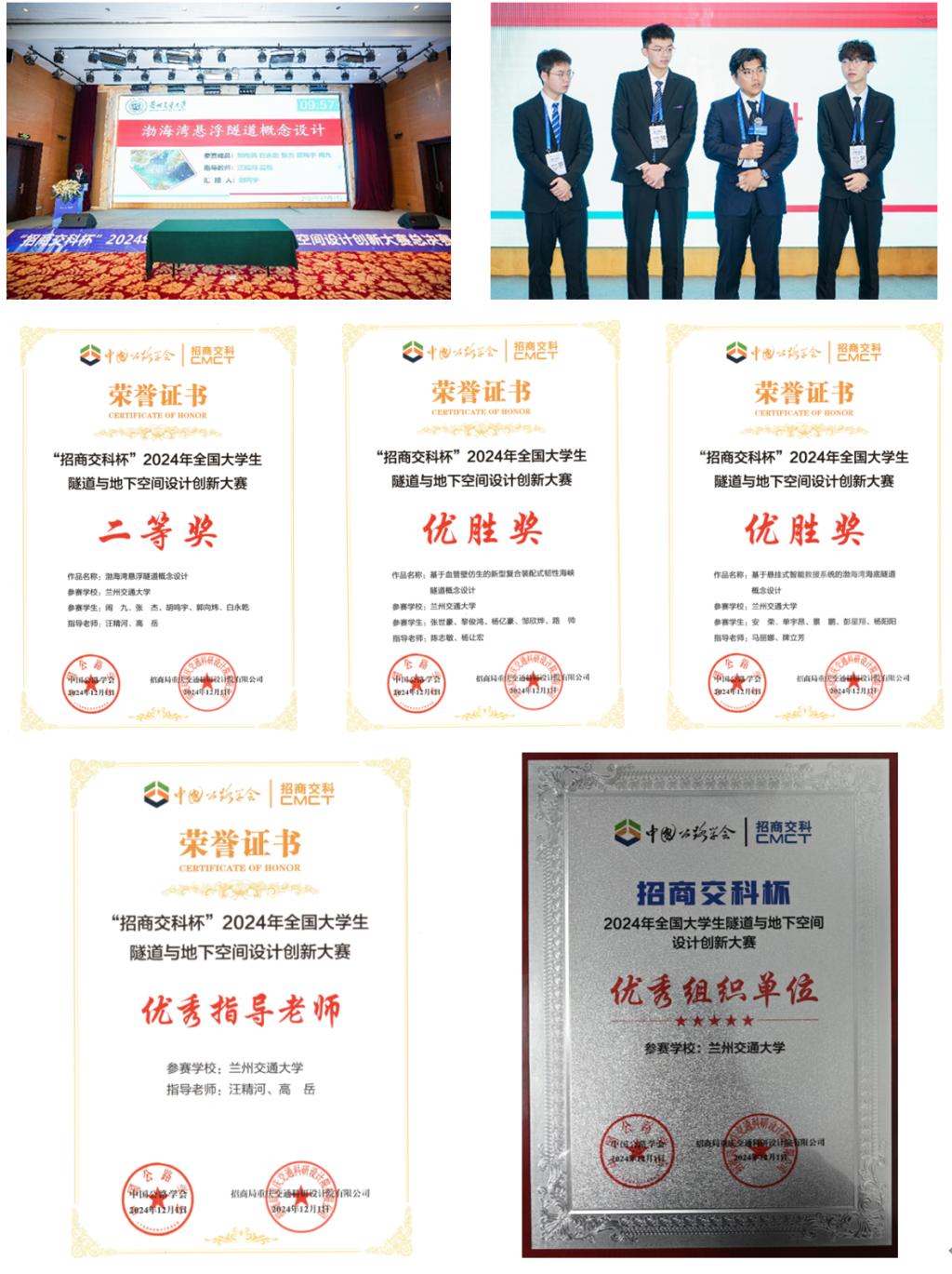 大赛共吸引了全国45所高校的近800名学生积极参与,经过专家组严格评审,仅有来自全国13所高校的26支队伍进入了现场决赛。由我院汪精河、高岳老师指导的闹九(2023级隧道方向硕士研究生)和土木工程2201班胡鸣宇、白永乾、张杰、郭向炜完成的作品“渤海湾悬浮隧道概念设计”代表兰州交通大学进入决赛答辩,专家评委从内容完整性、逻辑严密性、方案适应性、创新性观点的提出与合理论证以及安全、环保、低碳、美丽理念的体现等多个维度对参赛作品进行了全面细致的评审。最终“渤海湾悬浮隧道概念设计”荣获二等奖、汪精河、高岳获优秀指导教师奖,兰州交通大学获优秀组织奖,由陈志敏、杨让宏、马丽娜、牌立芳老师指导的参赛作品获优胜奖。