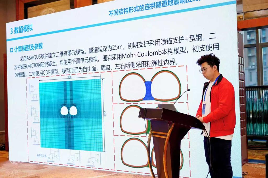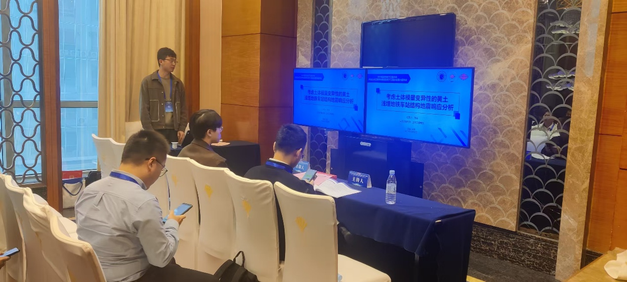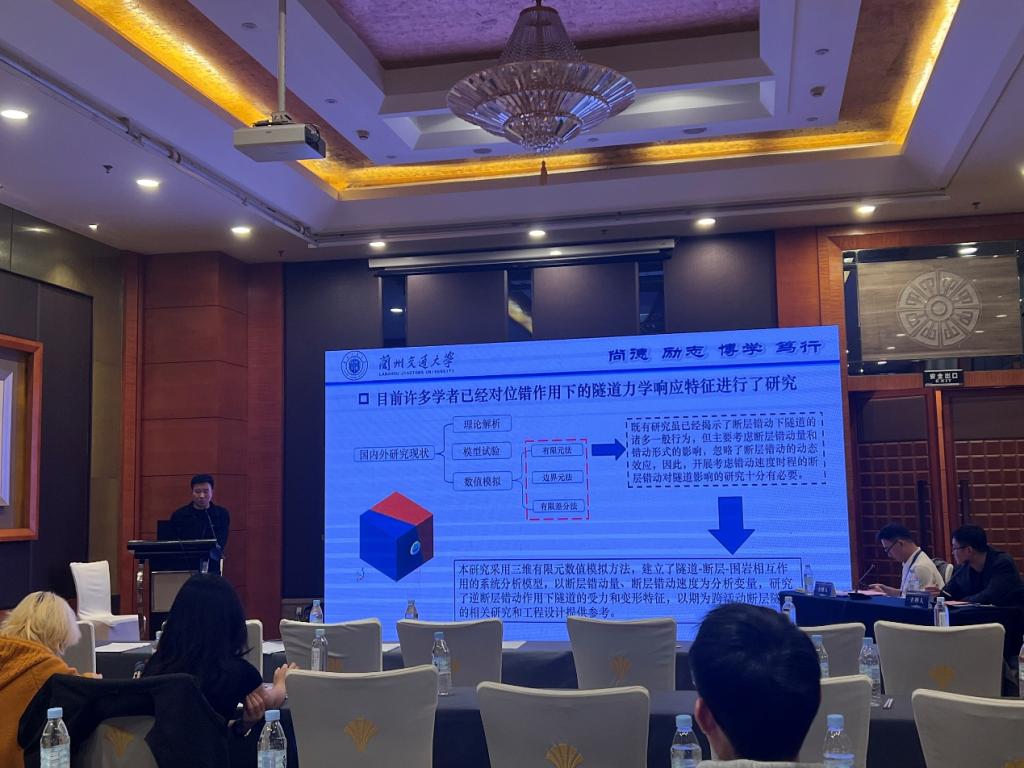 会议期间,梁庆国副院长作了题为《软弱地层地铁车站洞桩法施工变形控制技术研究》的特邀报告;牌立芳、汪精河、欧尔峰、李景等老师分别以《陆路交通隧道-滑坡体系灾变防控理论、关键技术及应用》、《波纹板-钢筋混凝土组合式明洞结构抗冲击性能研究》、《断层错动和地震动作用下隧道衬砌损伤特征分析》、《深埋倾斜层状岩体铁路隧道围岩稳定性研究》为题做分会场专题学术报告;研究生陈涛、张岳、李彦鹏分别以《不同结构形式的连拱隧道地震响应对比研究》、《考虑土体模量变异性的黄土浅埋地铁车站结构地震响成分析》、《基于错动速度函数的跨断层隧道受力变形特征研究》为题做了学术报告,并就相关技术问题进行了交流。这些报告内容翔实、创新性突出,收到与会代表的关注与好评,起到了很好的交流与宣传效果。